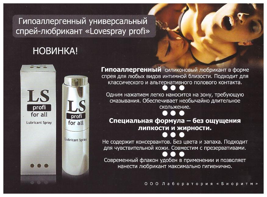 Гамма новых ощущений и мгновенный эффект. Гипоаллергенный универсальный силиконовый спрей-лубрикант для двоих. Легкое распыление , суппер долгое скольжение без ощущения липкости и жирности. Подходит для любого вида секса. Прекрасный вариант для чувствительной кожи. Применение: непосредственно перед половым актом . Распылить на интимные зоны требующие смазывания. Доза подбирается индивидуально , начиная с одного нажатия. Упаковка: флакон-атомайзер 18 мл. Страна Россия. Производитель: Лаборатория Биоритм.